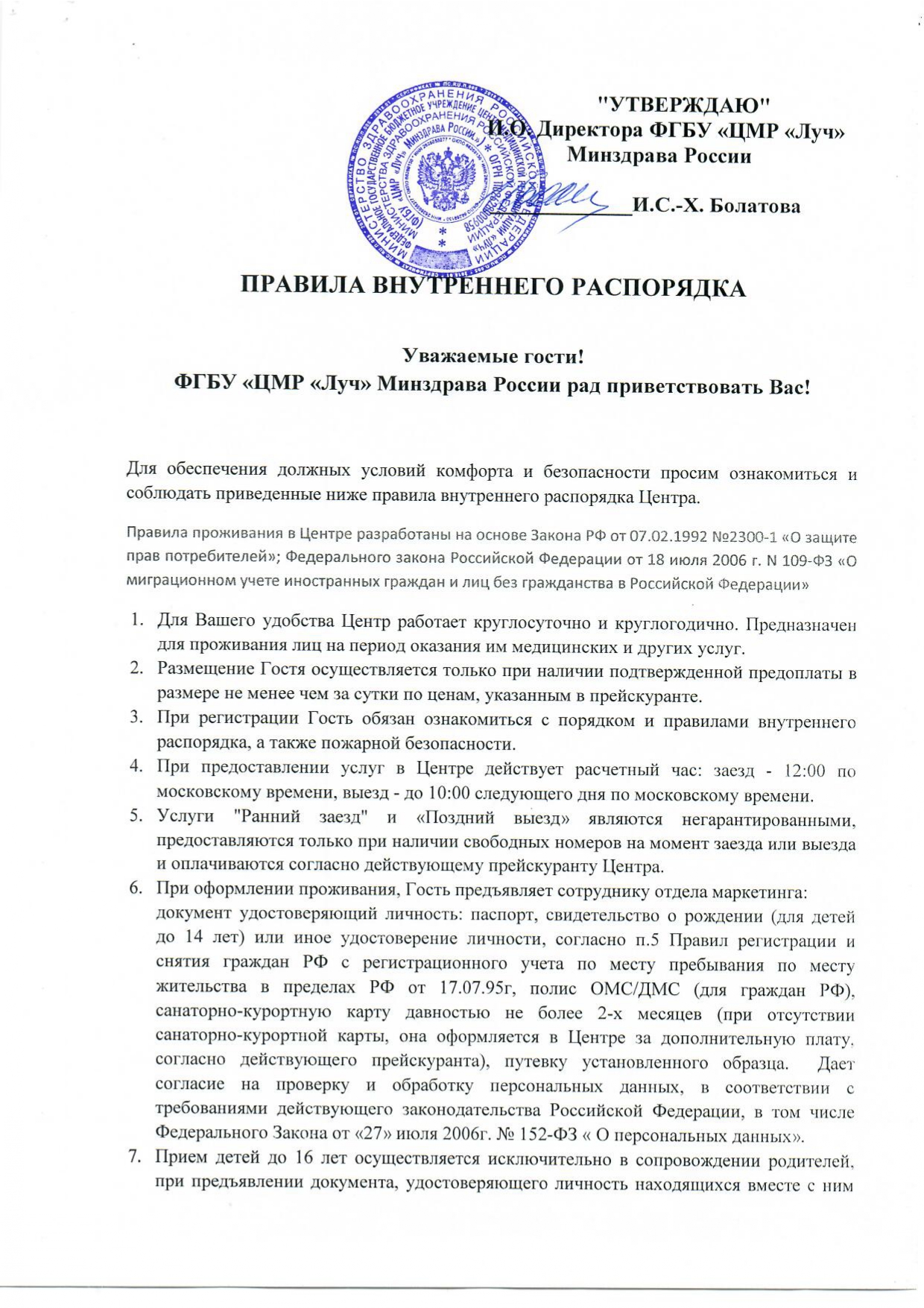 ПРАВИЛА поведения пациентов во время пребывания в ФГБУ ЦМР «Луч» Минздрава России в условиях сохранения рисков распространения COVID-19