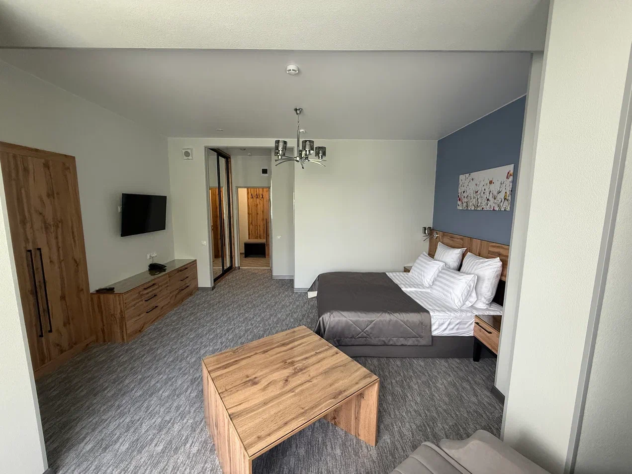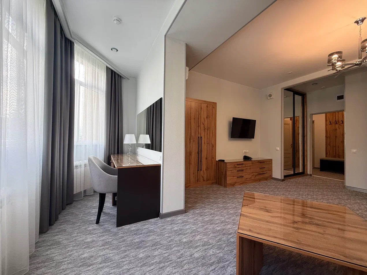 Трехкомнатный номер повышенной комфортности расположен в одиннадцатиэтажном здании первого корпуса с видом на панораму города, состоит из трех комнат - гостиной и двух спален. Уборка производится ежедневно.