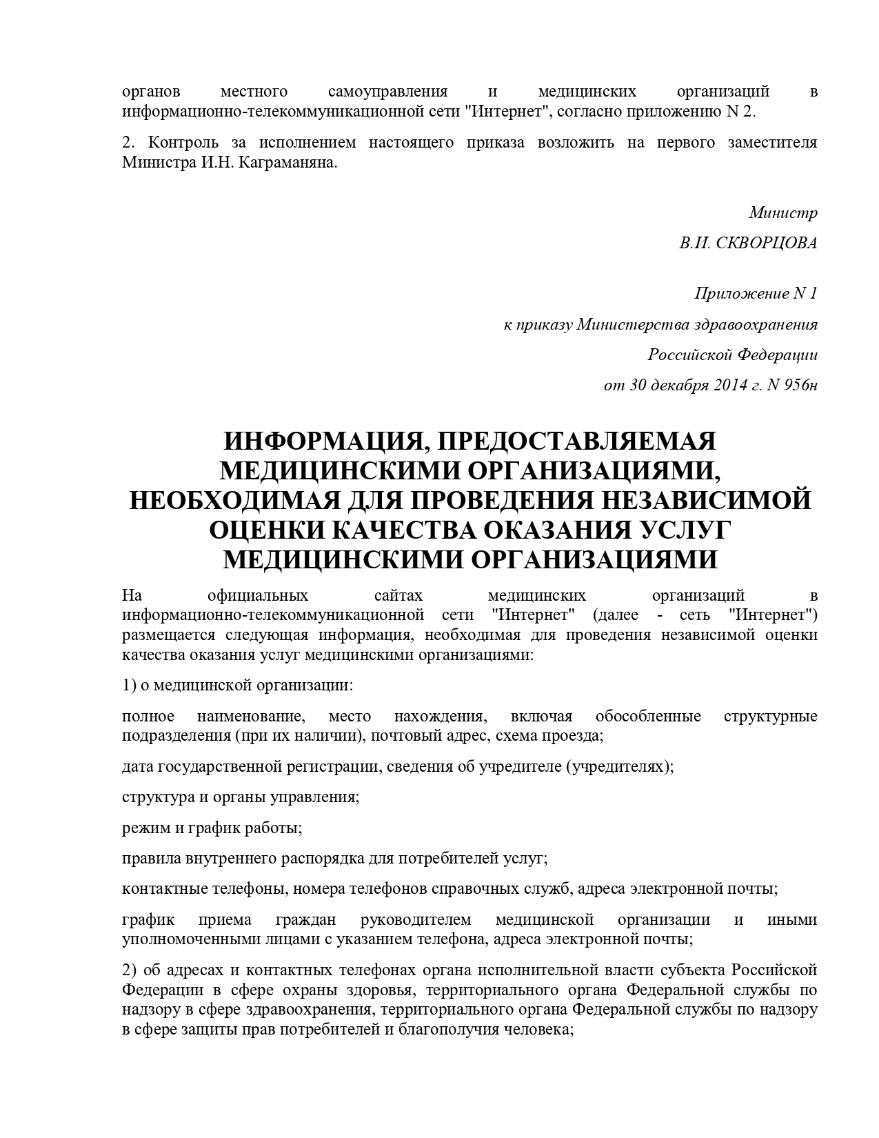 МИНИСТЕРСТВО ЗДРАВООХРАНЕНИЯ РОССИЙСКОЙ ФЕДЕРАЦИИ ПРИКАЗ от 30 декабря 2014 г. 956н ОБ ИНФОРМАЦИИ, НЕОБХОДИМОЙ ДЛЯ ПРОВЕДЕНИЯ НЕЗАВИСИМОЙ ОЦЕНКИ КАЧЕСТВА ОКАЗАНИЯ УСЛУГ МЕДИЦИНСКИМИ ОРГАНИЗАЦИЯМИ