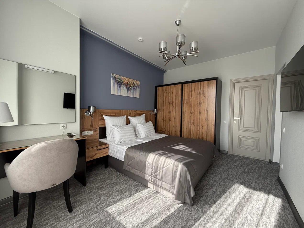 Трехкомнатный номер повышенной комфортности расположен в одиннадцатиэтажном здании первого корпуса с видом на панораму города, состоит из трех комнат - гостиной и двух спален. Уборка производится ежедневно.